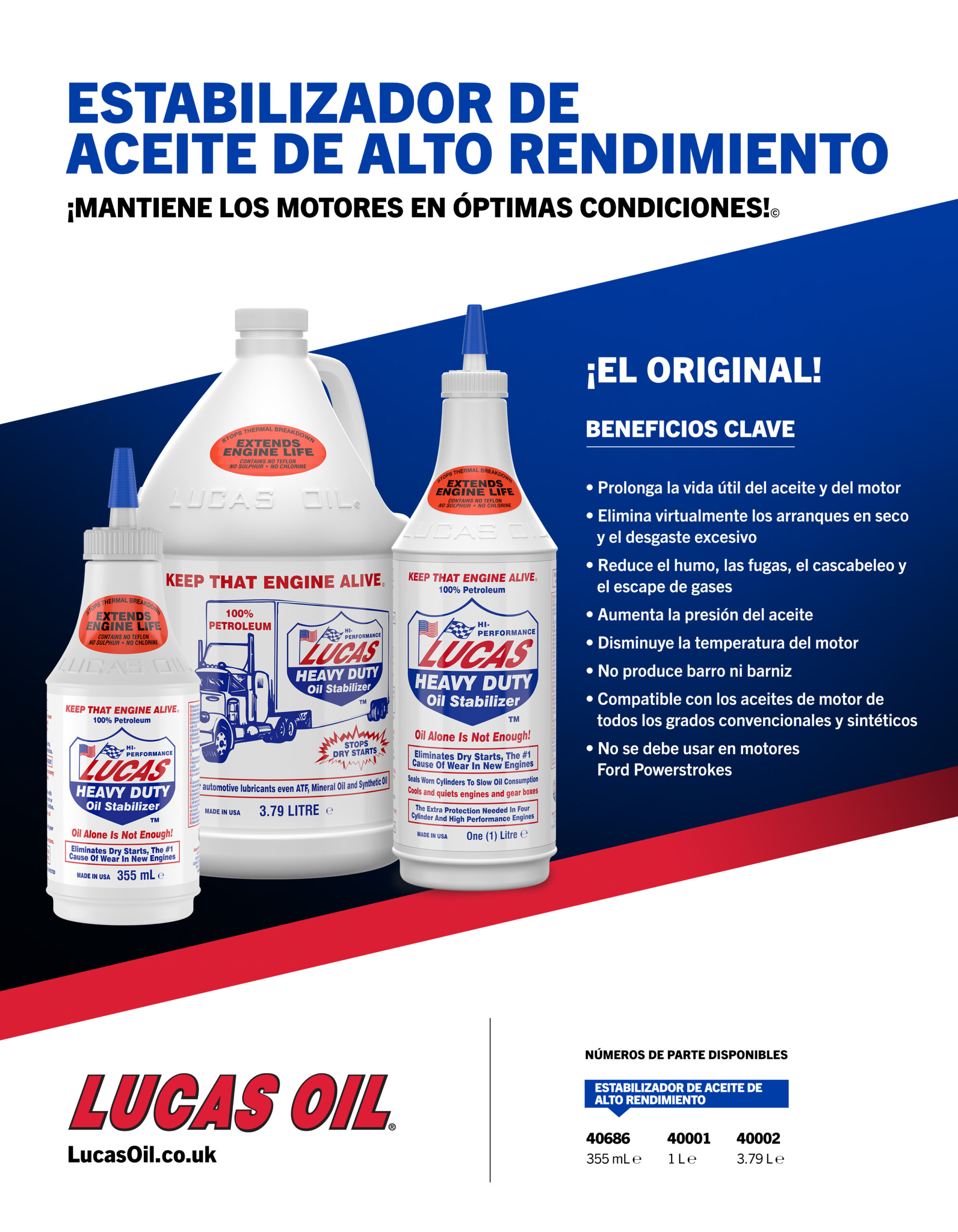 Lucas Oil Stabilizer is a 100% petroleum product formulated to eliminate dry starts and reduce friction, heat, and wear in any type of engine. It allows engine oils a higher degree of lubricity which reduces oil consumption and operating temperatures.