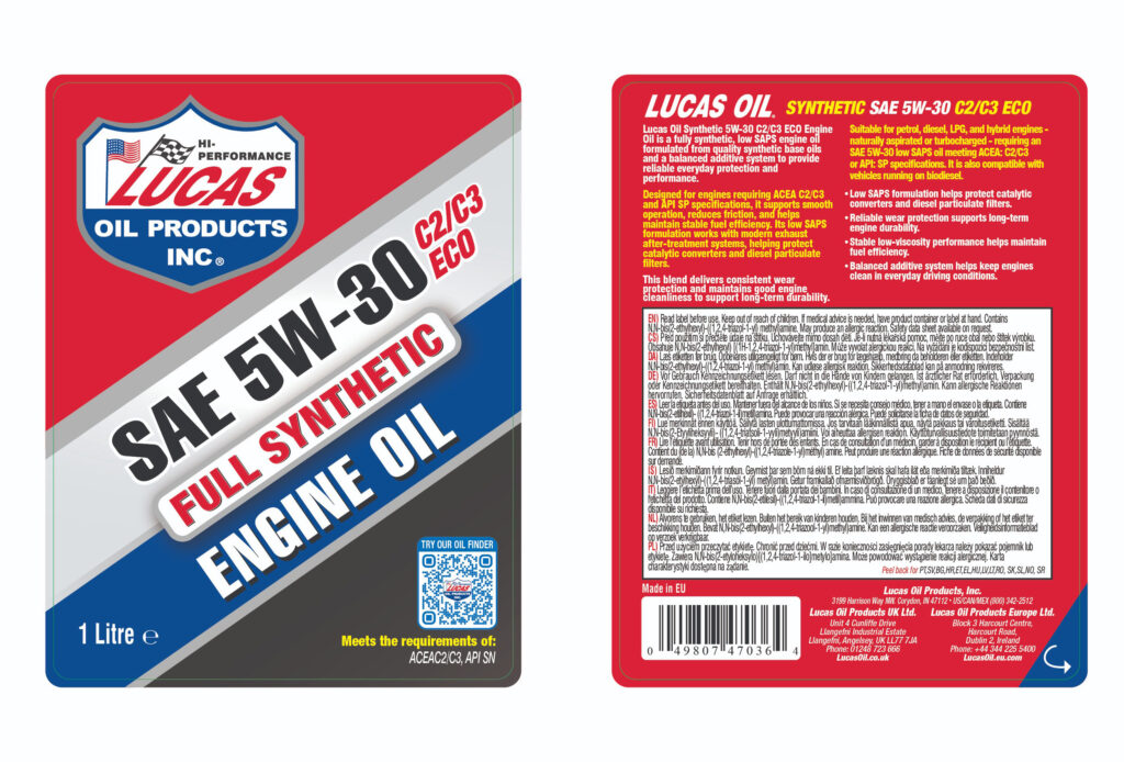 Lucas Oil Synthetic 5W-30 C2/C3 ECO Engine Oil is a fully synthetic, low SAPS engine oil formulated from quality synthetic base oils and a balanced additive system to provide reliable everyday protection and performance.