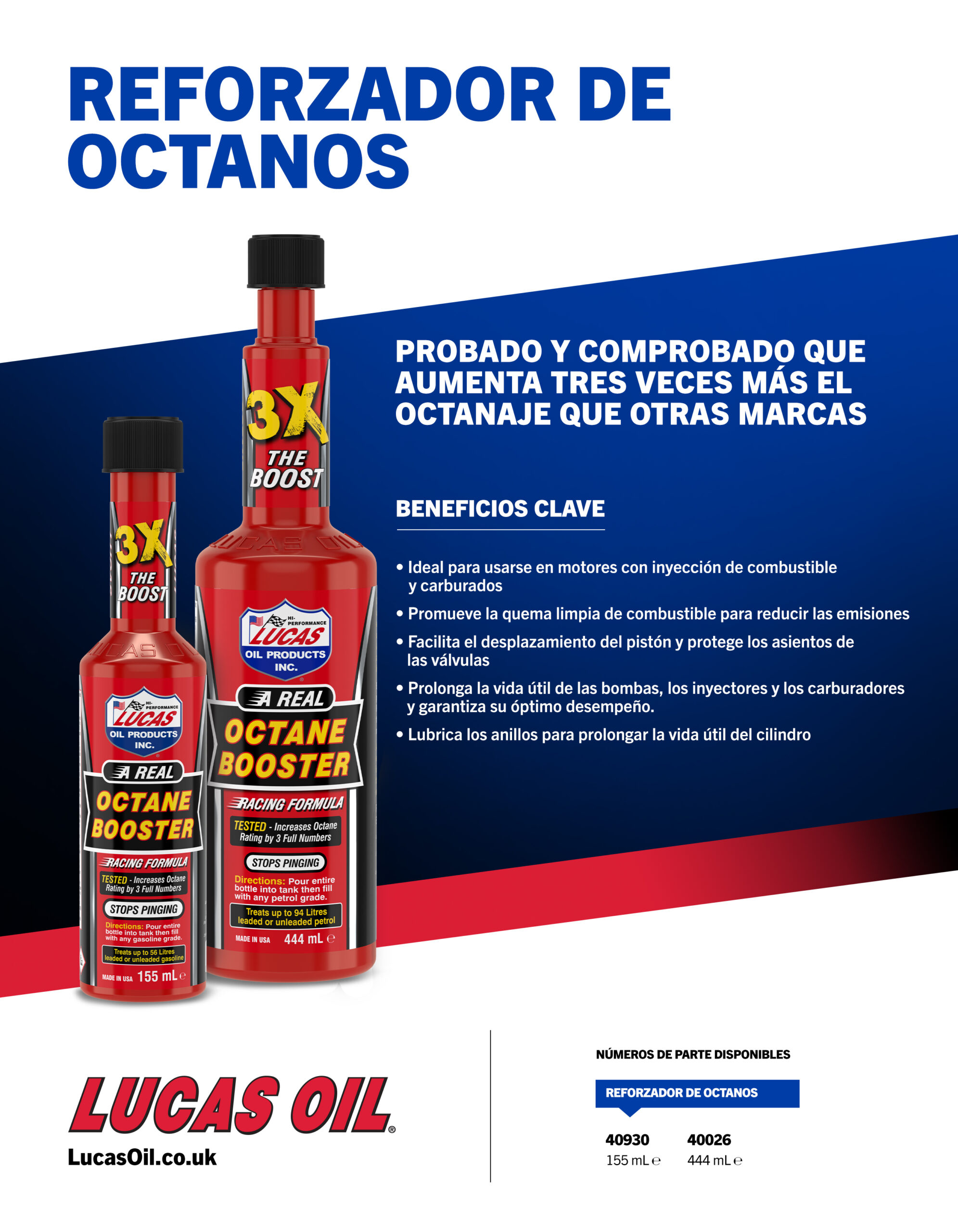 Lucas Octane Booster is tested and proven to deliver three times more boost than most other brands. It contains specific upper cylinder lubricants that ensure easier piston travel and valve seat protection, while also ensuring maximum life and performance from pumps, injectors and carburettors.