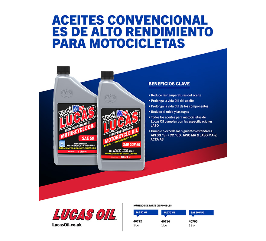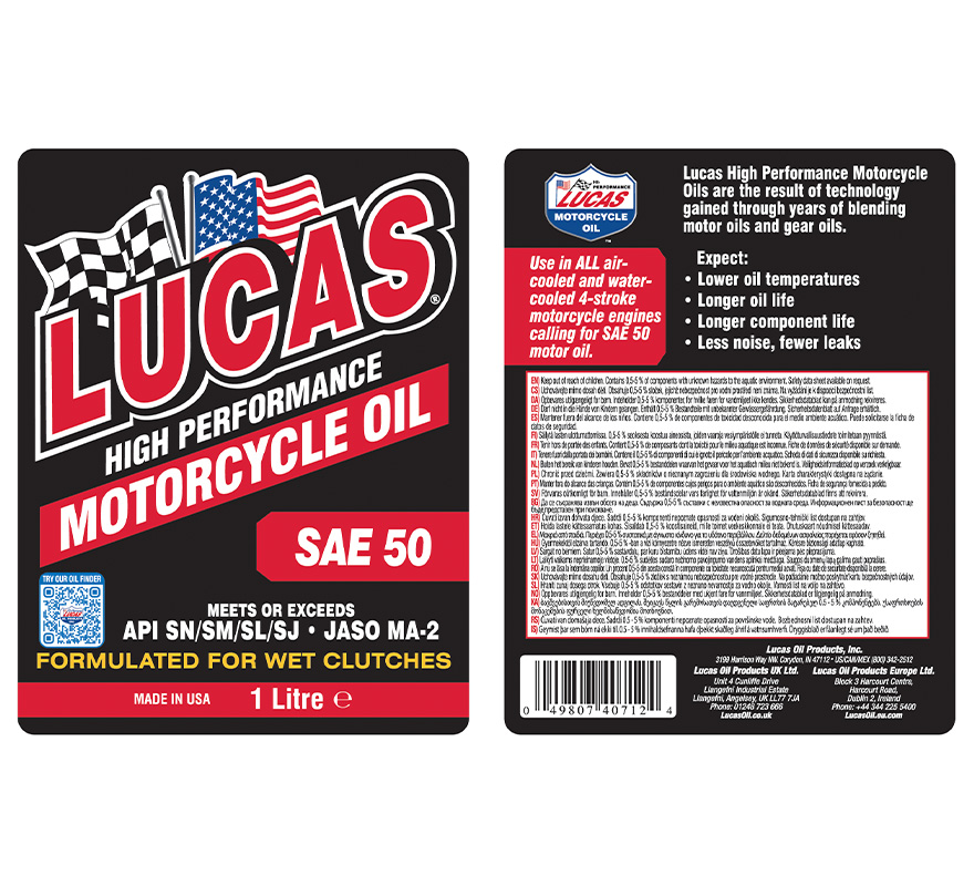 Lucas High Performance SAE 50WT Motorcycle Oil is the result of technology gained through years of blending engine oils and gear oils for the racing industry. It is built for endurance and will lower oil temperatures, extend the life of vital components, reduce noise and leaks, and increase performance.