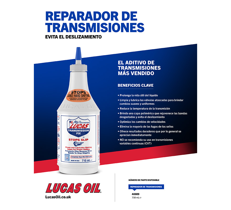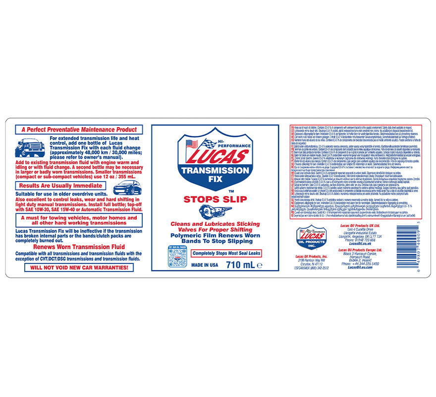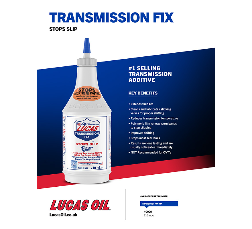 Lucas Transmission Fix is a non-solvent formula that stops slip, hesitation and rough shifting in worn transmissions and completely eliminates most seal leaks. Use in any transmission for preventative maintenance. Use also in light duty manual transmissions to increase shifting ease and transmission life.